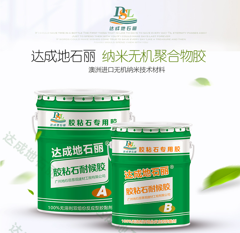 達成地石麗納米無機聚合物膠是雙組份100%反應固化型透明路用膠水,也叫彩色納米無機聚合物透水海綿路面材料,專門用于室外耐候型膠粘石透水地面、膠粘石地坪(彩膠石地坪),膠粘石發(fā)光地坪或凝砂鋼化地坪,區(qū)別于傳統(tǒng)環(huán)氧樹脂,達成地石麗納米無機聚合物膠具有更好的耐黃變性,區(qū)別于MDI類聚氨酯(通用聚氨酯膠),其耐水性、耐色變性和粘接力更好。配合石子做出不同色彩及圖案,樣色多種可調,光澤度高 ,極具裝飾性,擺脫行業(yè)內的透明單調。地坪行業(yè)習慣簡稱膠粘石耐候膠。也叫戶外地坪聚合物納米復合材料。