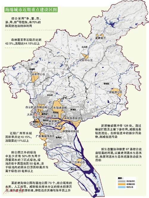 近期全市各區(qū)海綿城市的建設重點區(qū)域為:從化中心區(qū)和溫泉部分區(qū)域;南沙蕉門河中心區(qū);增城中心區(qū);天河車陂涌流域;海珠琶洲和廣紙地區(qū);番禺大學城、南站商務區(qū)部分區(qū)域和國際創(chuàng)新城;白云新城及周邊地區(qū);花都中心區(qū);荔灣大坦沙、芳村地區(qū);越秀流花湖片區(qū)、二沙島地區(qū);黃埔臨港經(jīng)濟區(qū)。