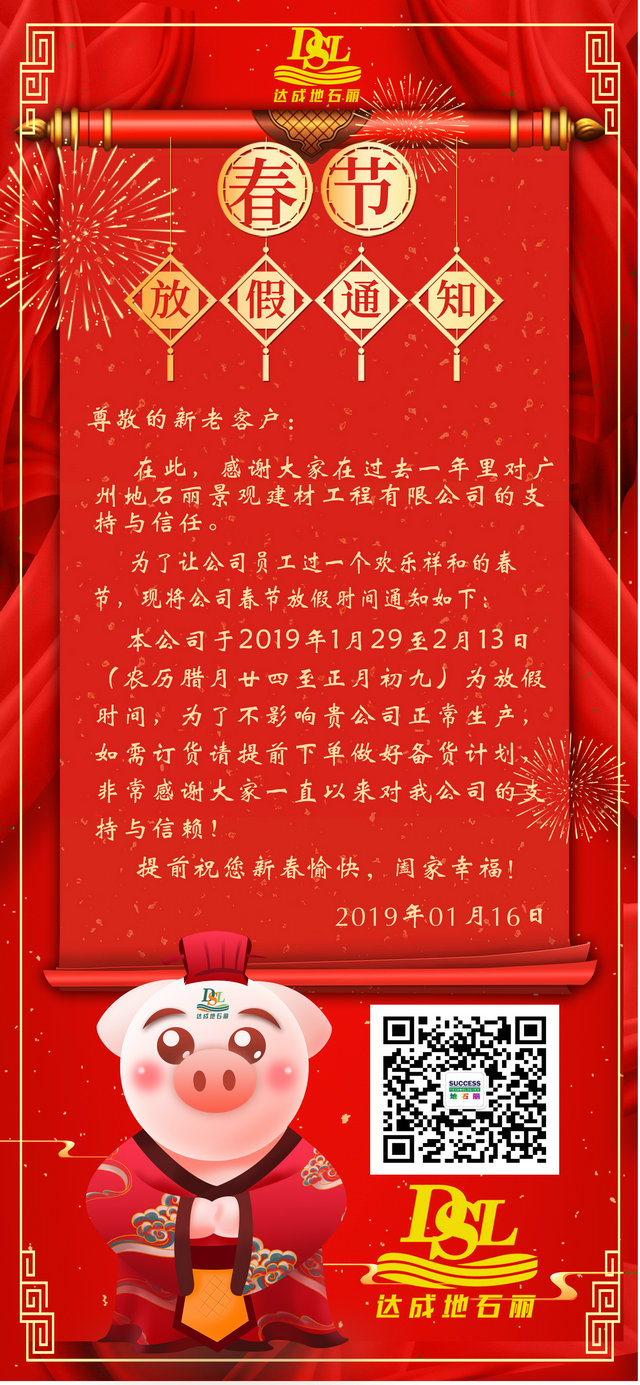 本公司于2019年1月29日至2月13日(農(nóng)歷臘月廿四至正月初九)為放假時間,為了不影響貴公司正常生產(chǎn),如需訂貨請?zhí)崆跋聠巫龊脗湄浻媱?。非常感謝大家一直以來對我公司的支持與信賴!